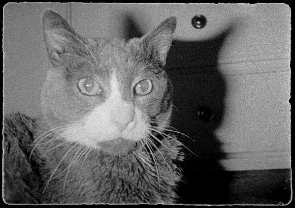 "The B&W is HiFi, a grey cat, a Minox BL image, using ND filter, Agfapan 400, Minox ME-1 flash low power, scanned on Polaroid Sprintscan, moderate assist in Photoshop with Extensis Intellihance."