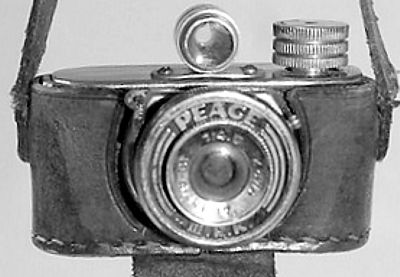 -- (1950) Fixed-focus 20mm (fixed f4.5) lens. Speeds of B and I. Round viewfinder on top. Was there a Peace II? Curious minds want to know!