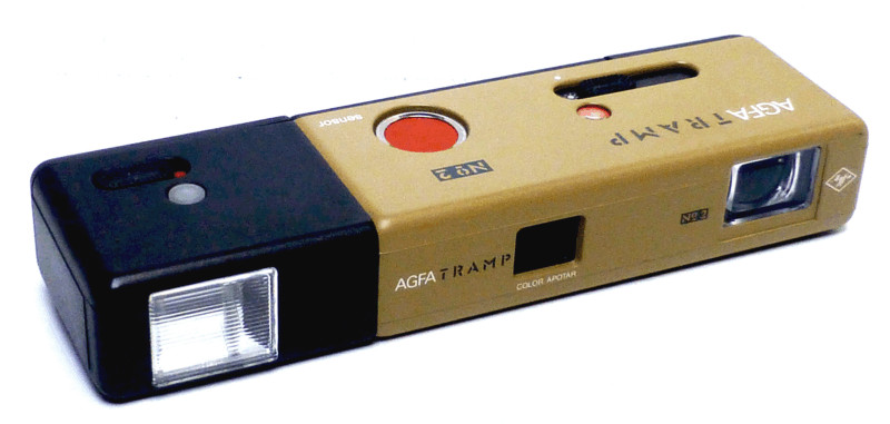 (1974) A conventional 110 camera with a twist. It has a fixed-focus "Color Agnar" 26mm (f9.5) lens. It has a mechanical, fixed shutter speed of 1/100 which switches to 1/50 when a flashcube is inserted. It is triggered by a circular, orange, resilient pad which Agfa insisted on referring to as the 'sensor'. It has the push-pull style of the Minolta 16 except that the push-pull does not advance the film -- it just covers everything up. It was resurrected four years later as the Agfamatic 508 which actually advanced the film and cocked the shutter when you closed it. Designed for 100 ASA film only.