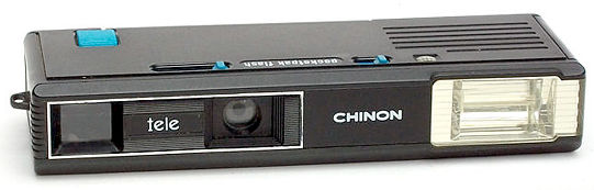 A simple, small and stylish 110 using the push-pull design of the Minox. Shutter speed of 1/90 -- 1/50 for flash use. Very compact when closed. Accepts ISO 100 and 400 films. Two-element f9.5 lens. Accepts flip-flash bars. Not to be confused with the Chinon Deluxe 110 Pocket (below).