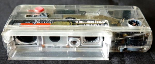 This 110 S model is the extremely rare transparent version used for dealer display. The camera is fully functional, but cannot be used for taking pictures since the film would be ruined by light leaks.
