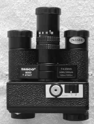Improved version of the 7800 112mm (f5.6-32.0), binocular-coupled, focusing lens. Mechanical shutter with speeds of 1/125 and 1/250. Tripod and cable release sockets. Camera sits on top of a 7x20 binocular. The accessory pack included a table top tripod with bracket, a set of filters (UV, yellow, and neutral), and two eye shields to block extraneous light.