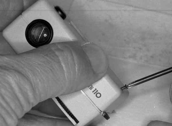 First, you have to take your 110 camera apart. For many 110 cameras, this amounts to just a couple of screws. But even in this case, remove things slowly and watch for parts that fall out from hidden nooks and crannies.