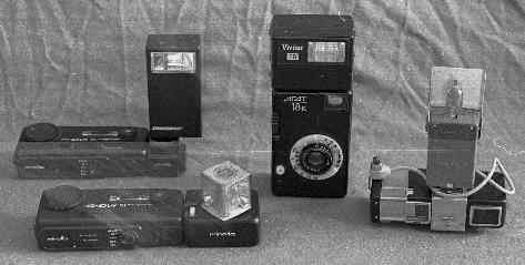Some subminis, like the Minolta MGS could use magi-cubes. Some, like the MGS, needed an adapter to do this. Others, like many 110 cameras, had the feature built-in. Other cameras had a shoe for the popular flip-flash. While it is difficult to find magi-cubes or the flip-flash today, there were electronic flash units designed to fit into the magi-cube and flip-flash shoes. For example, the Kodak Ektron II could be used instead of a flip-flash. The Kalimar (K-471, K-412 and K-418) Strobe A EF units, Tiffen Pocket strobe (234 and 560), Soligor X-110, ITT Magicflash, Hanimex WS, Foto 2001 and Unitron flashes came in models that could fit in the magic-cube or flip-flash sockets. These units were small and weighed about 4 ounces -- perfect for subminis. They took two AA batteries and provided about 100 flashes. Recycling time was 5 to 10 seconds and they could be used up to about 12 feet, depending on the film speed. Hunt around camera shops and shows for these little wonders. You'll be able to get them for next to nothing. Soligor also made a Pocket Flash adapter, so you can add a hot shoe to your 110 and add any flash. But be careful. Even if one of these adapters or flashes fits on your camera it may not work correctly with your shutter. The only way to know for sure is to test it out yourself.
