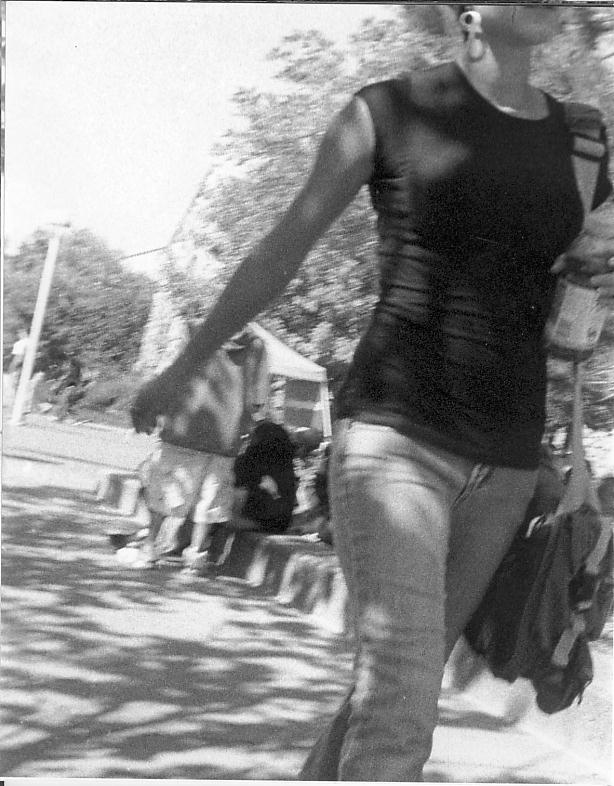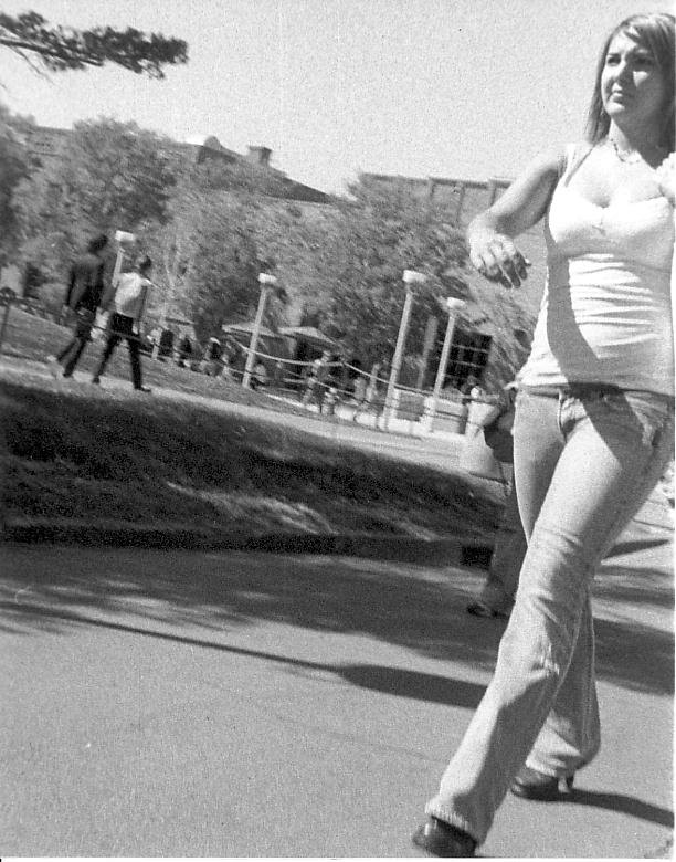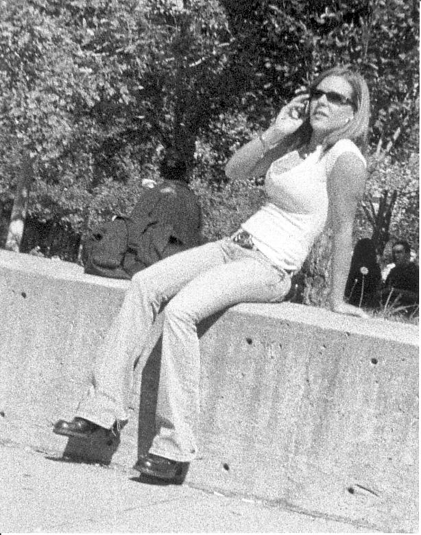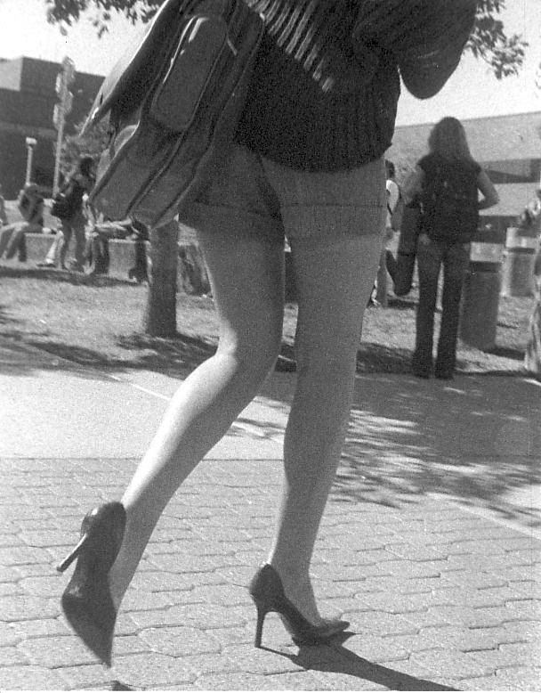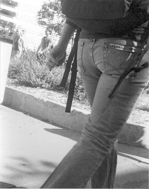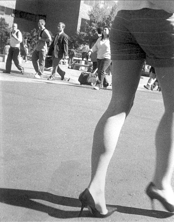 Let me tell you a little more about my approach. This description is the sort of thing I have to do in class. The Minolta MGS is the perfect tool for candid photography for several reasons. First, and foremost, it is very small and fits in the palm of your hand. When held by the side of the leg, the thumb rests conveniently on the shutter release and the film advance is easily performed without moving the camera position. As a result, no one knows you have a camera and that you are taking their picture. The MGS is about the size and shape of a cell phone which is a very common item for students to have in their hands. Sure, there are cell phones with cameras, but they don't have the flexibility and quality of the MGS -- as you will see. I wonder if that's a cellphone she's carrying, or if it's a 16mm camera and she's taking a picture of my front while I'm taking a picture of her rear?