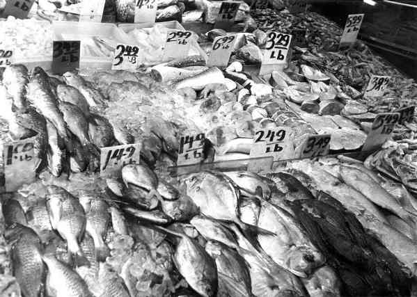 "Some of the finest selections of fresh fish in the city are available for way-below-uptown-prices in tiny storefronts that sprawl far out onto the crowded sidewalks of Chinatown. Even in black and white, you can practically feel the vibrant colors and smells... Once again, the Pen's 30-year-old mechanism came up with a perfect exposure: every kind of film I've used in this camera has come out beautifully, but good old Plus-X in it is pure magic."