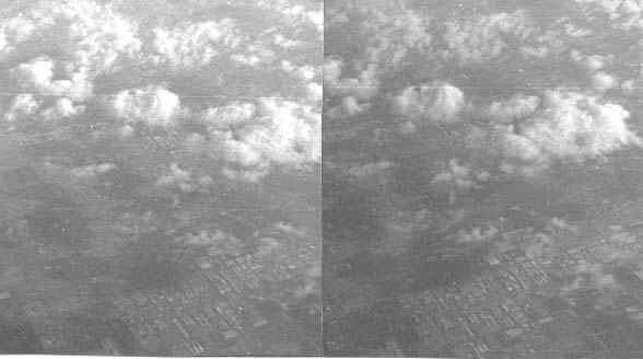 "This shot taken on another occasion while travelling between Austin & San Jose, shows 3D clouds floating above a small town. Again side-by-side sequential shots about a second apart. This time I processed the film/prints myself. Minox B, film was home split APX25. After assembling the prints, scanned by UMAX flatbed scanner.
