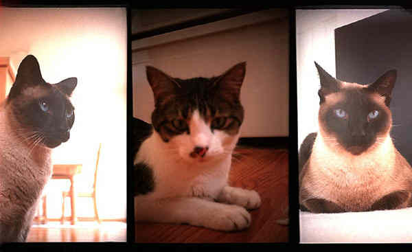 "The picture is called "Kitty Montage" which I shot on 400 film in available light. F-stop was 5.6 for the two pictures on either end, and the f-stop was wide open for the one in the middle."