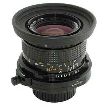A late entry into the line of MC Rokkor-X lenses, this was a completely new lens to the Minolta line-up of SLR lenses. It is referred to as a shift lens, but it is much more than that. It has shift capability (left/right), but it also has rise and fall capability (up/down) -- and any combination of the two, too. In addition, it has VFC capability that allows the field of focus to be curved in or out for complete control of what is in focus. It has an automatic diaphragm, but it's extra-wide coverage makes it too wide to maintain the meter coupling feature. Needless to say, the optical formula is completely different from the other 35mm f2.8 lenses becuse it needs a MUCH wider image circle than normal. Another unusual feature is that it has TWO "filter rings" -- just as with the Rokkor-X 40-80mm f2.8 zoom lens. The innermost is for standard filter use, while the outer ring is for the extra-wide lens shade. |