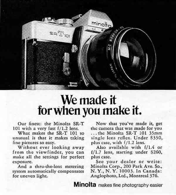 The SRT101 would have sold much better had there been better marketing by Minolta. With all of the other camera companies touting their "automatic lenses", "built-in meters", "TTL metering", "professional features", ad nauseum, it was difficult for the average consumer to separte the wheat from the chaff. Full-aperture metering was a new concept and the typical new camera buyer had no idea how important it was. And Minolta's marketing never told them. Likewise, the other companies never mentioned in their ads that there were serious limitations to their "advanced metering features", like the need to stop-down the lens. The benefits of full-aperture metering were incomprehensible to someone who had never owned an SLR camera before. In fact, Nikon, Canon, Pentax, and Olympus were unable to produce any TTL, full-aperture SLR cameras until 1972 -- six years after the SRT101 made its debut! Still, despite the lackluster marketing, the SRT101 sold well and was manufactured from 1966 until 1975 -- a run of nine years -- when it was replaced by the more fully-featured SRT201. The SRT101 was one of the most innovative cameras in photographic history. In fact, it is held in such high regard that an SRT101, in like-new condition, will sell for more today that it cost in 1966!