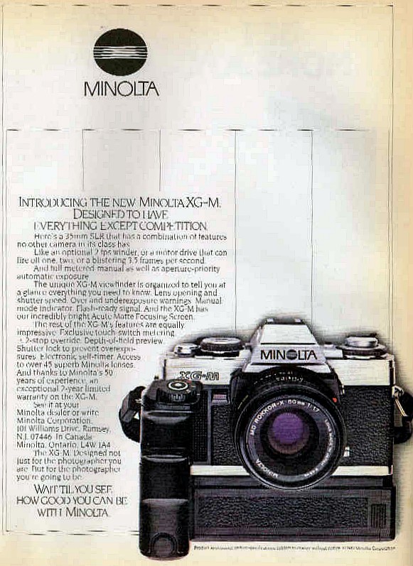 (1981) The XG-9 of 1979 was the top of the line camera in the XG series, but it had one major drawback -- it lacked a metered-manual mode. Sure, it had manual settings of the shutter speed, but the meter turned off when these were used. This kept enough consumers away that Minolta decided in 1981 to upgrade the XG-9, and it produced the XG-M. It is a modified version of the XG-9 but with several new features, including a new body style with a built-in grip on the body. The old XG-style body was small, light and comfortable, but Minolta thought they could improve on it.
