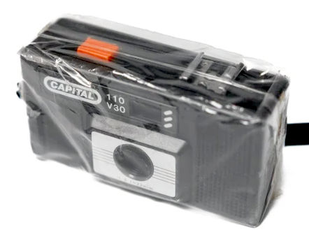 This is a cheap, disguised 110 with a fixed lens and shutter -- disguised as a cheap 35mm camera. It looks just like a typical, cheap 35mm camera, but it is, in fact, a cheap 110 camera instead! It's redeeming quality is that it has a HOT SHOE -- no kidding -- so if you have an automatic flash, you can turn this into an auto-exposure, 110 camera. Sold as the Capital 110 V30 label -- and probably others.