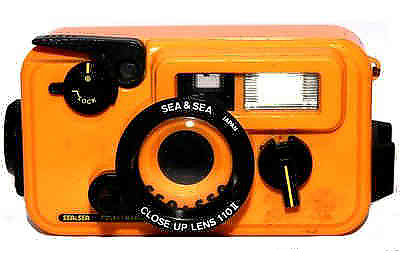 It's the size and shape of some 35mm underwater cameras, but it is a 110 camera that uses two AA batteries to power the built-in flash unit -- and the built-in motor drive. That's why it's so large. The camera has a 20mm f4.0, fixed-focus lens, and a single shutter speed of 1/125s. There are two aperture settings for SUNNY (f5.6), CLOUDY (f4), and FLASH (f4 w/flash). It also has a shutter release lock, and over-sized control knobs It is waterproof to 150 feet, and came in a Yellow or Orange body. It will work with 16mm perforated film, with a minor modification to the operating procedure. The motor drive will advance the film about 15mm when the perforations are in the path of the perforation sensor arm. Thus it appears to skip one perforation in the advance cycle. Therefore, by 'shooting' a 'blank' frame (i.e., firing the shutter with the lens covered such as with your hand) and allowing the motor drive to advance the film again it accepts perforated film without any frame overlap. This should place the frame separation at about 30mm instead of the normal ~25mm – wasting a small amount of film. Who knows who actually made it, but it was also sold as the Hanimex Amphibian 110 MF.