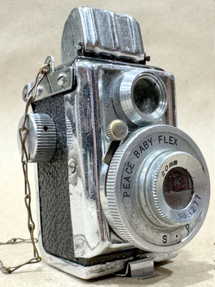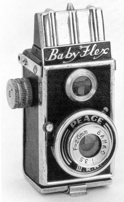 -- (1950) This is a tiny twin lens reflex (TLR) camera with a pop-up viewfinder. It produced 14x14mm images, but it's not a quality shooter -- at least not the original model. It has a Sanko 20mm f3.5 lens, but the Peace shutter evolved over time -- starting with simple I & B settings to a version with speeds of B, 1/25 - 1/150. It later became the similar Peace Baby Flex (see below). To complicate matters further, it should not be confused with the much larger Baby Flex, a TLR made by Kinax -- using 120 film. Got all that straight?