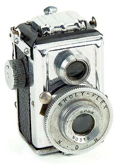 -- (1950) This is a tiny twin lens reflex (TLR) camera with pop-up viewfinder. Fixed-focus 20mm f3.5-11.0 lens. Speeds of B and I. Probably a later version of the Baby Flex (above). Also sold as the Peace Baby Flex (above) and the Sholy-Flex camera (below).