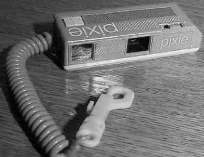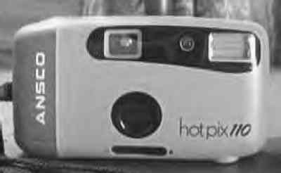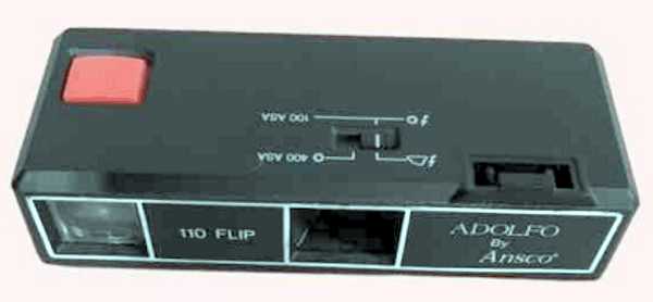 Small, bare-bones 110 camera. It comes with an odd telephone-cord strap with a big alligator clip. I guess this is so you can attach it to your belt and keep it in your pocket, and pull it out whenever you need it. It comes in various flashy colors, such as aquamarine. Takes a flip-flash.