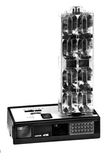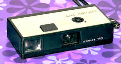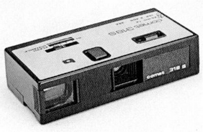 (1975) The 310 was the first Comet (presented at the 1974 Photokina) and had some very nice features for a 110 camera at the time. It had a fast, fixed-focus 25mm f5.6 lens with five aperture settings up to f16 -- controlled by a small lever on the top with weather symbols. It had two speeds: 1/80 -- and 1/40 when a Magi-cube was inserted. Designed for ASA 100 film only.