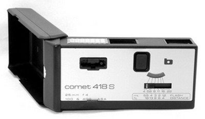 (1976) The 418 was a Deluxe version of the Comet 310. It sported a faster 25mm f4.0 lens with six aperture settings to f22 which were selected with the help of a built-in selenium meter. The normal shutter speed was increased slightly to 1/100, and the flash speed increased to 1/50. It uses a Flip-flash instead of Magi-cubes. Designed for ASA 100 film only.