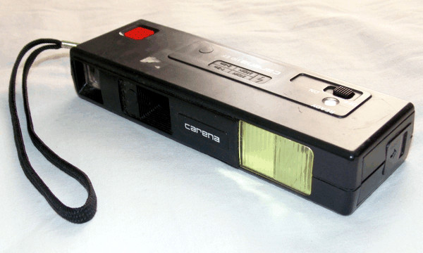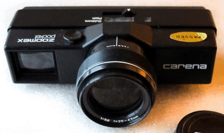 It's the same as the Zenix Zoom TS, Petri PF Zoom, Porst Zoompocket 200, Petri zoom 110 2S, and Keystone Zoom 66. It has a seven element, 25-42mm f:5.6 zoom lens with three aperture settings -- f5.6, f9.5, and f16. These are set by selecting from three different weather symbols on the top of the camera. This did not adjust the shutter speed in any way. There are two speeds -- 1/125 and 1/250 -- which are selected by the film speed tab on the 110 cassette. ISO 100 gives 1/125, while ISO 400 selects 1/250. No meter needed. The lens focuses from infinity to two feet.