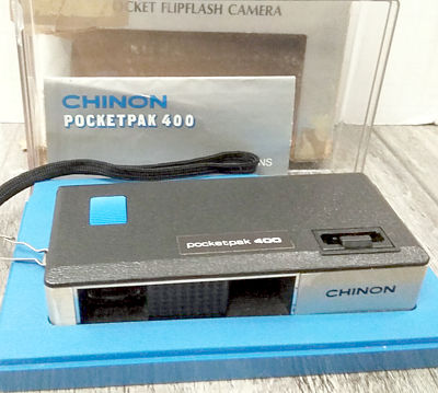 A simple, small and stylish 110 using the push-pull design of the Minox. Shutter speed of 1/90 -- 1/50 for flash use. Very compact when closed. Accepts ISO 100 and 400 films. Two-element f9.5 lens. Accepts flip-flash bars. Not to be confused with the Chinon Deluxe 110 Pocket (below).