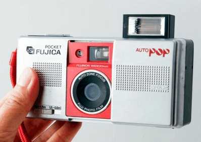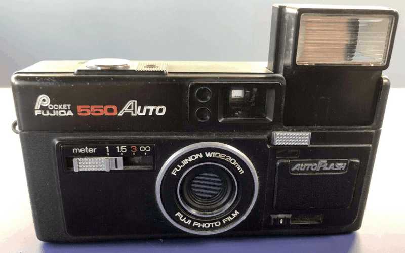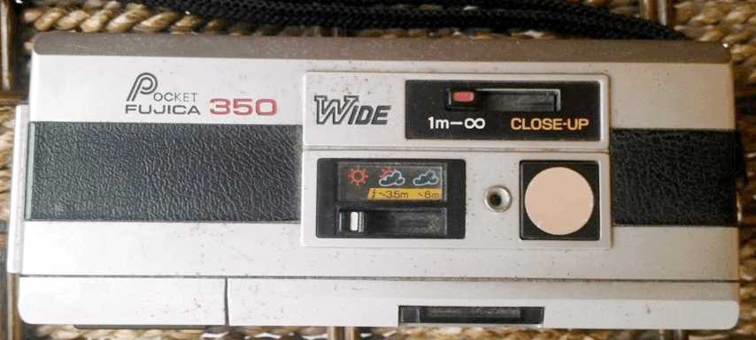 And upgraded version of the Pocket 350 Flash, it has a faster 20mm f4.0 zone-focusing lens with close-focusing to 2 feet. It has a fixed shutter speed of 1/160, but the f-stop can be adjusted by weather symbols on the front. It takes 100 or 400 speed film. Has tripod socket and cable release connection. Built-in flash takes two AA batteries.
