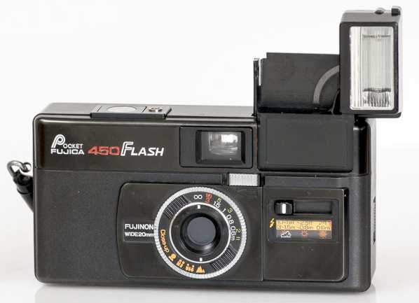 And upgraded version of the Pocket 450 Flash, it has the same 20mm f4.0 zone-focusing lens, but there is no need to adjust the aperture by weather symbols on the front -- it does it automatically. On top of that, the CDS meter controls the flash -- if you choose to turn it on. It takes 100 or 400 speed film. Has tripod socket and cable release connection. Built-in flash takes two AA batteries.