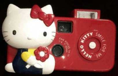 Not to be confused with Fuji's 35mm Hello Kitties, this 110 vertical camera -- with a pop-up flash -- is a bare-bones camera with a fixed-focus 20mm f4 lens. The kitty rotates to cover up the viewfinder and lens!!! It was available in different colors -- just like kitties -- and also as the Sanrio Hello Kitty.