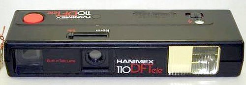 Often referred to simply as the "Hanimex DTF" because those letters are capitalized, the 110DFTele is basically the same as the CF Tele (above) but in colors -- red, white, pink, yellow, etc., and black, too! 25mm and 43mm switchable lenses with a selection switch on top. Built-in electronic flash with an ON/OFF switch on top. Uses two AA batteries. Basically the same as the Tele 110 TF (below) but with the controls in different places on the top.