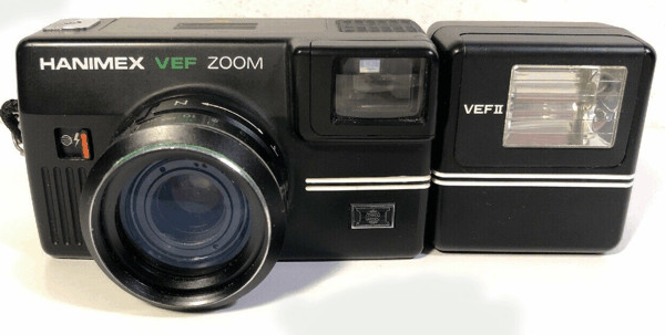 (1975) Deluxe version of the VEF with 26-42mm f5.6 zoom lens. Two aperture settings: f11 for sun and f5.6 for indoors. Fixed 1/125 shutter speed. Focusing from infinity to 1.5 feet. Special clip-on Hanimex VEF II flash unit which needs two AA batteries.