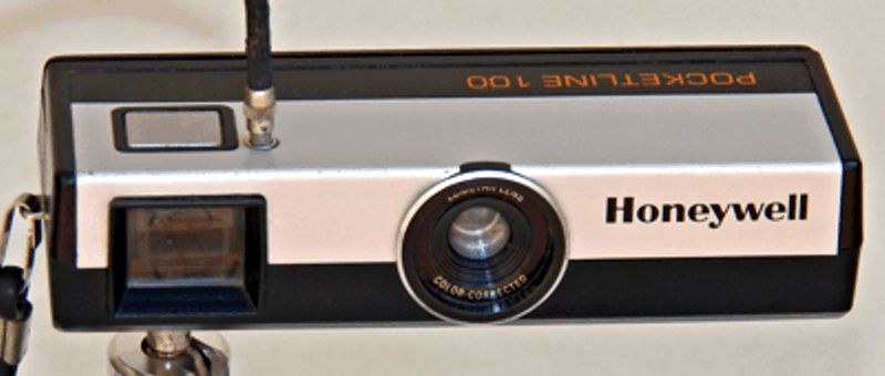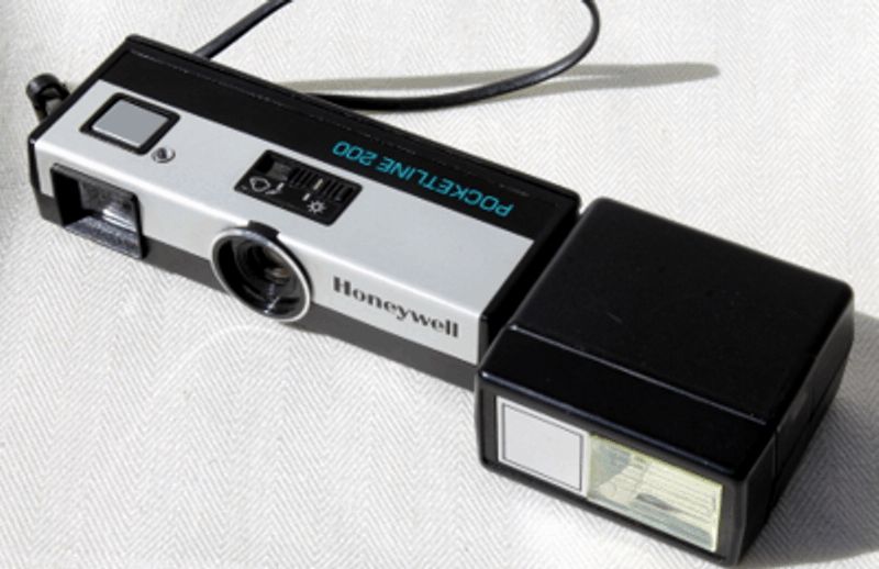(1977) A step up! Fixed-focus 26mm f5.6 Lumetar lens. It still has only a single speed of 1/125, but now two aperture settings -- f9 for sunlight, and f5.6 for low-light or flash. It has both cable release and tripod sockets. Standard hot shoe on one end. The Pocketline flash uses two AA batteries. Exactly the same as the Rollei Pocketline 200 camera.