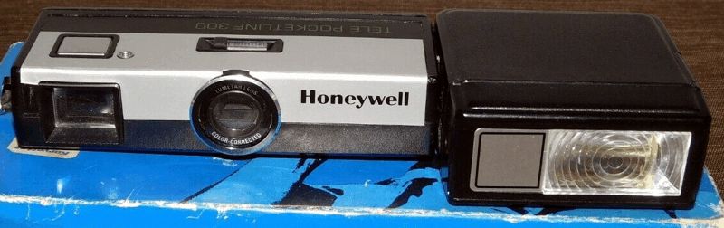 (1977) A side-step! A wider, fixed-focus 24.5mm f11 Lumetar lens, but a tele lens can be slid in. Single speed of 1/100. It has both cable release and tripod sockets. Standard hot shoe on one end. The Pocketline flash uses two AA batteries. Exactly the same as the Rollei Pocketline 300 camera.