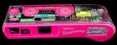 A very common model of 110 that was sold under a number of other names, such as the Kraft Cheesasaurus Rex Super Sleuth, and the Newport Alive with Pleasure cameras -- yes, there really were cameras with names like these! The original Micro 110 was available in a variety of colors, such as pink and teal. Bare bone as to features. A single fixed shutter speed. Not to be confused with the Micro 110 keychain 110 camera -- not made by Kalimar.