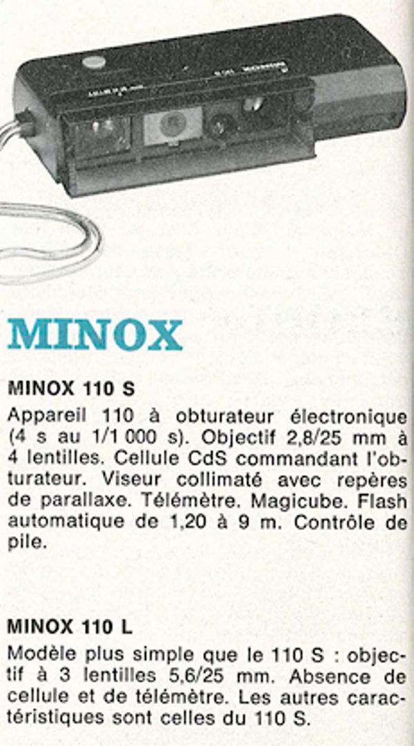 (1978) The features of this camera are great -- not just for a 110. The front of the camera had a unique set of "french-doors" that protected the lens, viewfinder, rangefinder and meter. This camera is considered to have one of the top ten submini lenses -- a 25mm (f2.8-22), 4 element/3 group, rangefinder-coupled, focusing lens. Close focusing to 24 inches. Dimensions are 5" x 1" x 2" and only 5 ounces. There is a unique distance and depth-of-field scale on the top of the cameras that changes according to f-stop. Focus scale can be set to feet or meters. Flash mode f-stop is linked to the focus slider, and depth-of-field works in that mode too. Built-in flash cube socket on the top of the camera. Matched flash unit available. Flash shutter speed is 1/40. Shutter locks when the front cover is closed, the flash-cube is in firing position, or when film is not advanced -- nice touches. Electronic shutter with speeds of 4 seconds to 1/1000. CDS meter provides aperture-priority automatic exposure control. Tripod and cable release sockets. Camera sets correctly to 100 or 400 speed film. Parallax corrected viewfinder, f-stop readout, overexposure and low-speed/shake warning lights (1/30 sec) in the viewfinder -- incredible! The batteries are mounted in the film door near the hinge, but you'll need a bright light to see the orientation marks. Needs two 625 batteries. Original list price of nearly $300. Actually, the 110S wasn't a Minox except in name. It was made by Balda which until recently did all of Minox's plastic fabrication. Balda went on to market similar 110 cameras on their own. If anyone would like to write-up a more extension description of this great camera, please contact us.