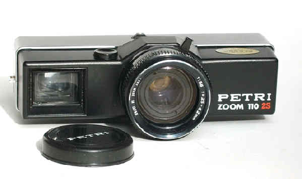 (1975) Petri gets into a market that is already dominated by Kodak, Pentax, Minolta and many others. Their first 110 was bare-bones -- one speed, one aperture. 1/100s and f11 on a 24.5mm lens. ISO 100 speed film only, and only in direct sunlight.