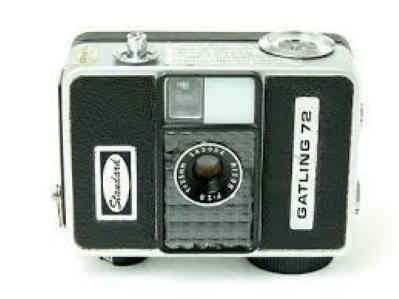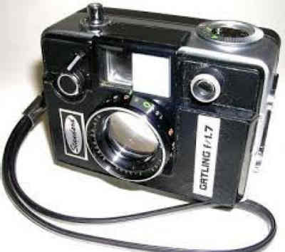 This is basically the same as the Ricoh Auto Half E. The features that made it popular were its small size, automatic exposure and built-in spring-motor drive. It had a trusty four element, three group 25mm (f2.8) fixed-focus lens that would appear on Ricoh (and other) half-frames for years to come. The shutter had two speeds of 1/30 (for flash) and 1/125. The selenium meter around the lens controlled the exposure at 1/125. The spring drive could advance 25 - 30 exposures before winding was needed (It did not offer motorized rewind, like the Canon Dial cameras) Tripod socket and PC contact on the side. A cold flash shoe was available as an accessory and screwed into the tripod socket. Ricoh also made several flash units that screwed into the tripod socket and made contact with the PC contact (which is next to the tripod socket) -- a nice setup that they used on several of their cameras, not just half-frames. Strange, rectangular filters that snapped on over the lens, meter and viewfinder were available as accessories. The main difference is that the camera has leatherette and the nameplates are turned 90 degrees.
