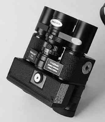 (1977) 112mm (f5.6-32.0), binocular-coupled, focusing lens. Mechanical shutter with speed of 1/125. Tripod and cable release sockets. Camera sits on top of a 7x20 binocular. The accessory pack included a table top tripod with bracket, a set of filters (UV, yellow, and neutral), and two eye shields to block extraneous light. Same as the Orinox.
