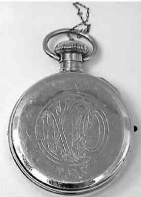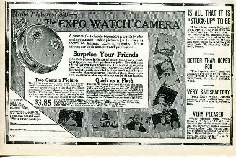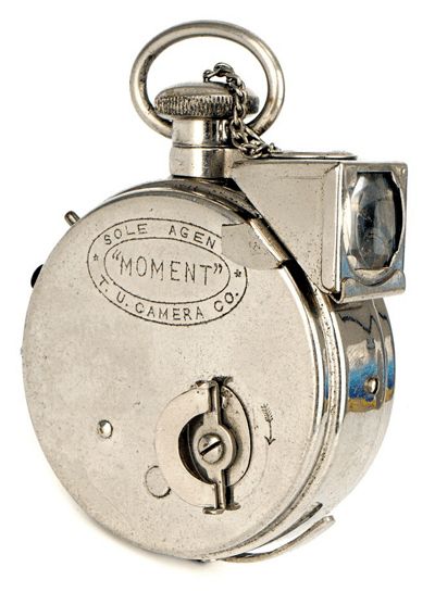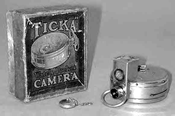 At the turn of the century, disguised cameras were the rage and the Ticka fanned the flames by selling an inexpensive pocketwatch camera. The camera did not have a watch inside, and it is a little large for a pocketwatch -- about an inch thick and nearly three inches across -- but it is still very pocketable. It had two shutter speeds -- B and I (1/50) -- and a fixed-focus 30mm (f16) lens. It took about two dozen 16x22mm images on 16" rolls of film in special metal & wood cassettes. The lens was inside the "neck" of the "watch" -- the "watch's winding knob" acting as a lenscap! A wide variety of accessories were available, such as a waist-level finder, an eye-level finder, an enlarger, shutter timer, tripod and more. In addition, various modifications to the camera were made in different countries over several years -- these are very rare and prized by collectors. A solid silver model was sold for one year in England as was a model with a watchface. The watch didn't work, but the watch hands were fixed at 10:10 pointing out the angle of view of the lens. There was even a model with a focal plane shutter offering speeds from 1/75 to 1/400, plus B. On some models a focusing f6.5 lens was available.