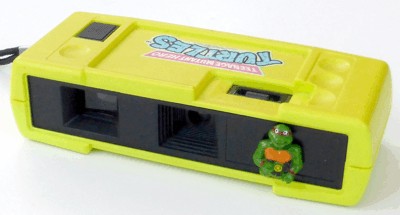 Yet another "theme" 110 -- this one has a Turtles faceplate. Uses flash bars. Comes in various shades of puke green -- and even pumpkin orange. The good news is that since the camera does not use the film perforations to cock the shutter, this camera can be reloaded with 16mm film -- in 110 cassettes.