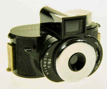 (1950) It's the same lens (f6.3) and shutter (single speed) as the Micro 16, but in a completely redesigned body -- much smaller -- in a lighter, plastic/bakelite package. It has the same single shutter speed (1/50) and the same three aperture settings -- "BRIGHT", "DULL", and "COLOR", but the reflex and slide-out viewfinders are gone. Instead a simple viewfinder was added to the top. The other big difference was the film cassette. Instead of two separate cassettes, it used a single, small, double-lobed cassette. In addition, the film counter is now on the top of the camera -- on the exterior!