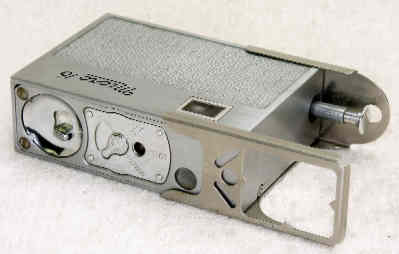 (1950) Even though it was smaller than a pack of cigarettes -- and perhaps designed to fit in one -- this all metal submini is pretty heavy. If you plan on putting it in a cigarette package, make it a hard-pack. The Micro 16 has a single speed shutter (1/50) combinded with a mediocre, two-element, fixed-focus, f6.3 lens. The f-stop is adjustable, however, with three settings, -- "BRIGHT", "DULL", and "COLOR" -- which were changed with a finger-nail tab on the front of the camera. These are probably f6.3, 11, and 16. A protruding tab on one end of the camera is pushed in to advance the film and cock the shutter. The camera "evolved" slightly over time. The camera has a built-in waist-level viewfinder, but later, a slip-on, slide-out viewfinder -- like on the later Mamiya 16 -- was available. And the later models have some red paint added to the front settings -- big deal. The camera was available in chrome (most common), as well as black, blue, and green. A film advance "tooth" pushes the film from one cassette to another, similar to the Steky and later Rollei 16mm cameras. The Micro 16 was designed for perforated film -- but single or double perf will work fine. Tripod socket and exposure counter (to 24) on the bottom.